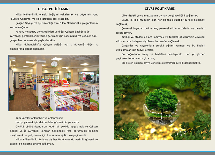 Firmamızda uygulanmakta olan tüm süreçlerin, uluslararası kalite düzeyinde gerçekleştirilmesi ve çalışanların katılımı ile sürekli iyileştirilmesi, faaliyetlerimiz sırasında çevrenin korunması, kurmuş olduğumuz tesislerde müşterilerimizin ekonomik ve teknik gereksinimlerine en uygun bir şekilde gerçekleştirilmesi, vazgeçilmez prensiplerimiz arasındadır.